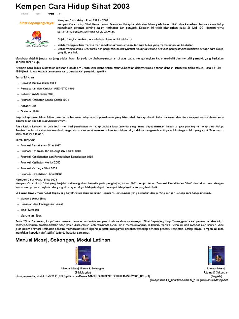 Untuk meningkatkan taraf kesihatan penduduk Malaysia melalui promosi amalan-amalan sihat dan mesra alam. Elemen dalam Cara Hidup Sihat. Kempen Amalan Gaya Hidup Tidak Sihat Jadual Rutin Imunisasi Kementerian Kesihatan Malaysia.